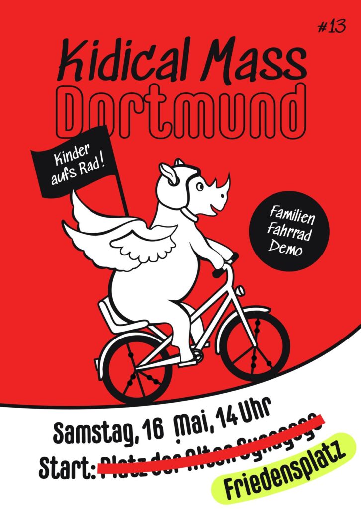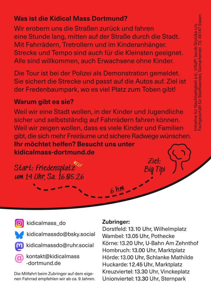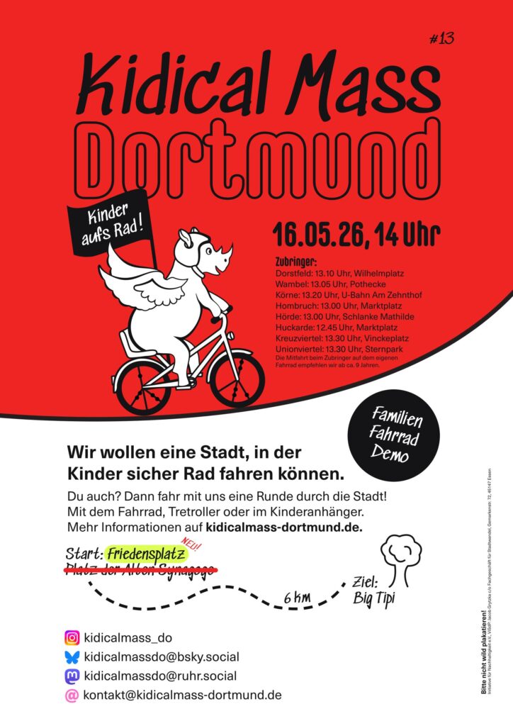 Die nächste Kidical Mass (#13) findet am Samstag, dem 16. Mai 2026 statt. Abfahrt wird um 14 Uhr auf dem Friedensplatz sein, Ende am Big Tipi im Fredenbaumpark.