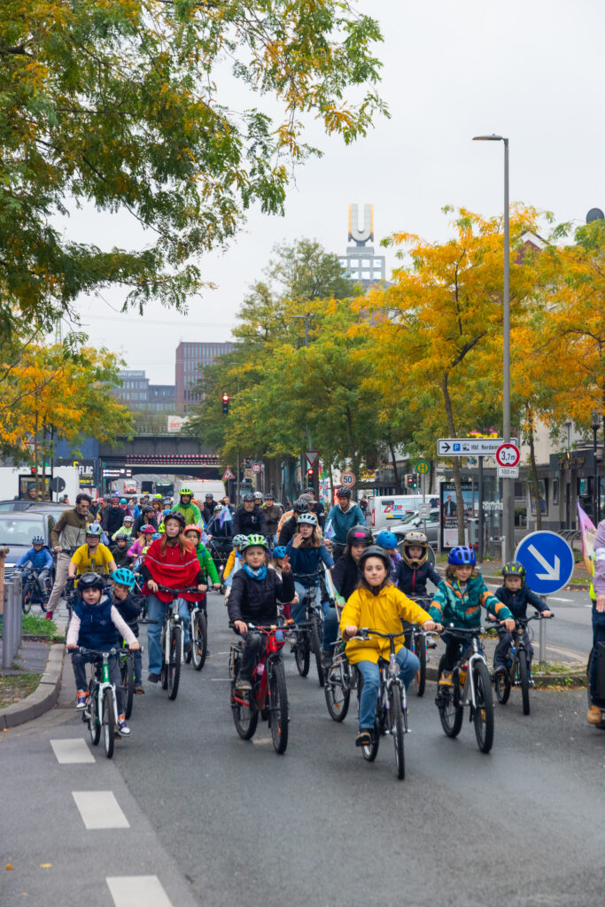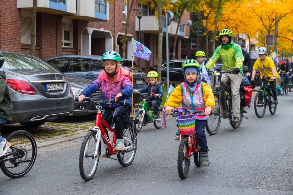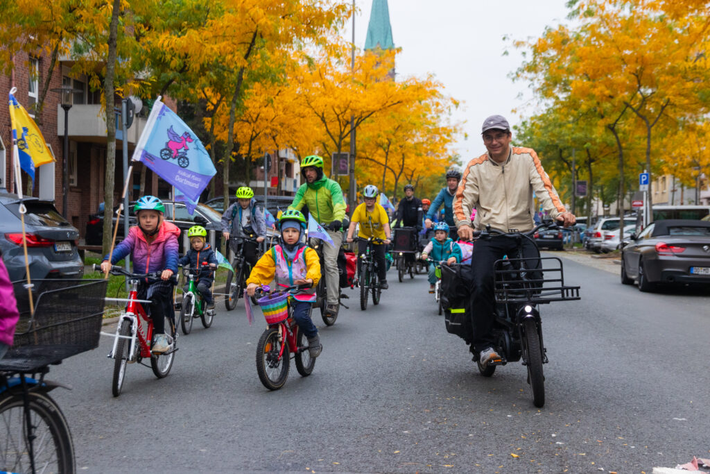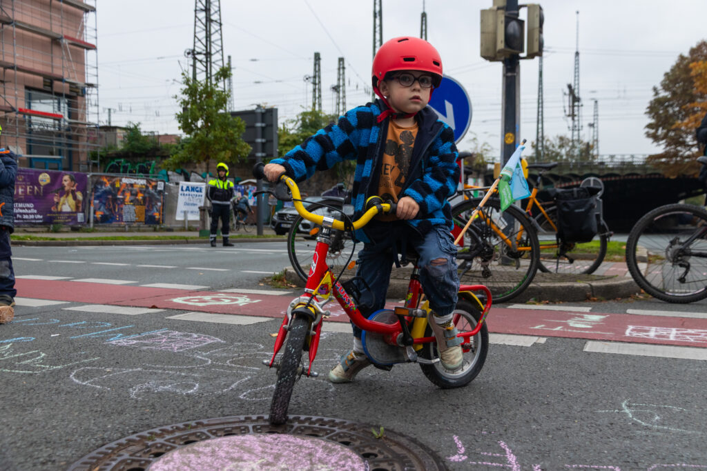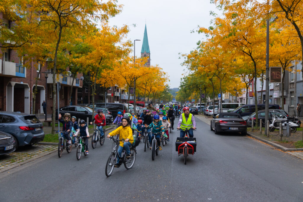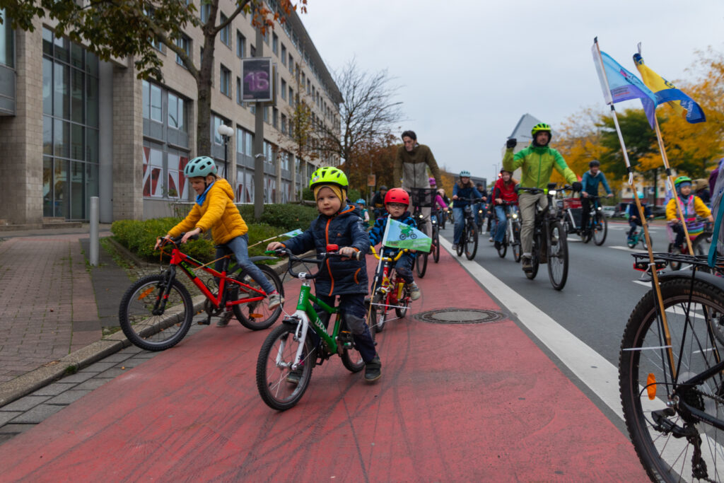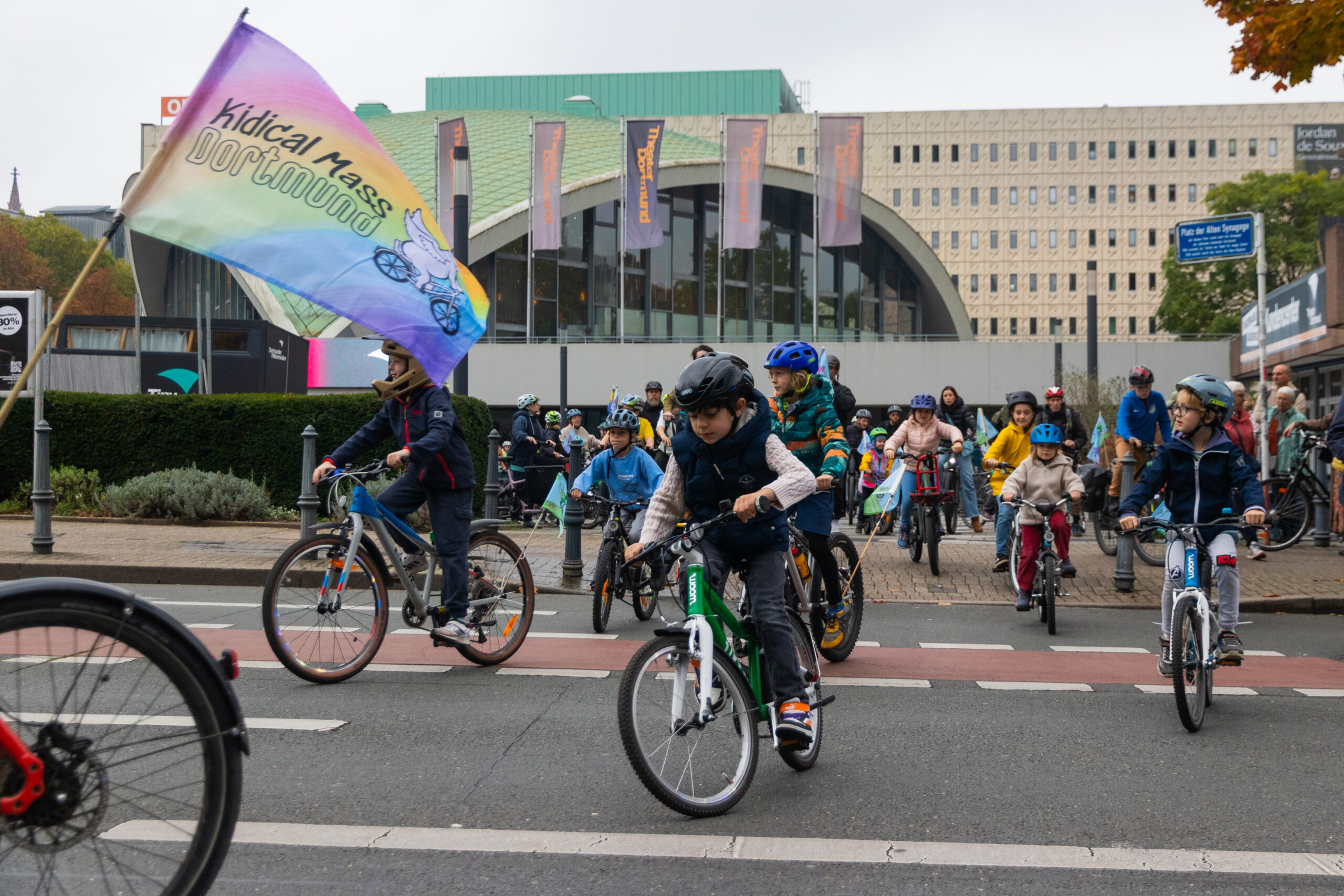 Am Samstag, dem 11. Oktober 2025, zogen erneut viele Radfahrende bei der Kidical Mass durch Dortmund. Die Familienfahrraddemo, welche in diesem Herbst erst im Oktober statt fand, sorgte wieder für Sichtbarkeit von Kindern und Familien auf Fahrrädern oder Tretrollern – viele der Kleinsten sassen bei den Eltern in Lastenrädern, Anhängern oder in Kindersitzen – auf Dortmunder Straßen. Oder sagen wir besser die Familienfahrraddemo, die weiterhin statt finden MUSS, denn an den Forderungen der Kidical Mass hat sich nichts verändert und es muss noch viel passieren, damit Kinder und Jugendliche in Dortmund sicher Rad fahren können!
