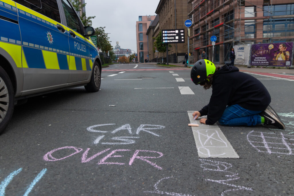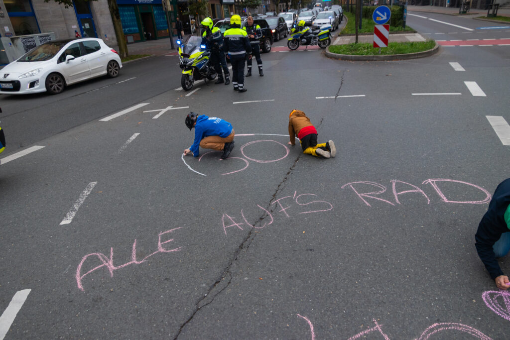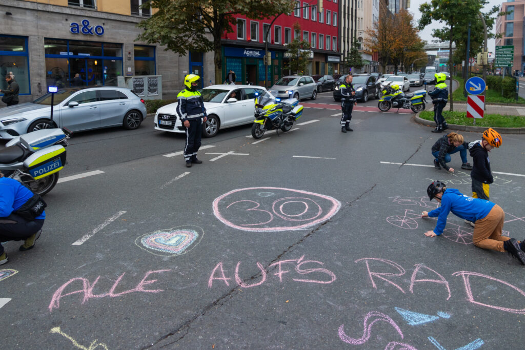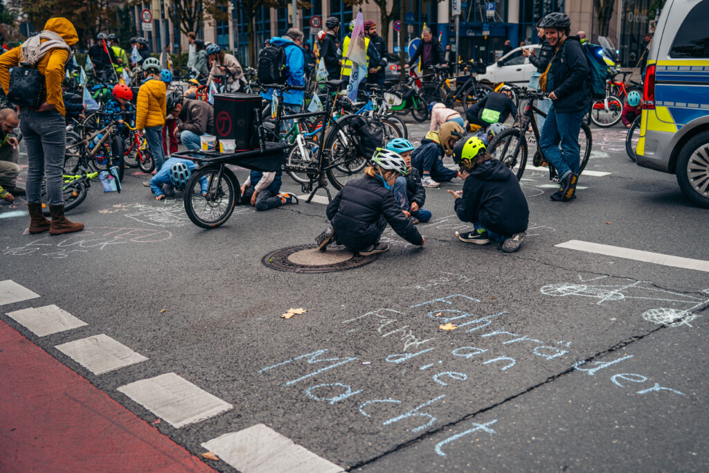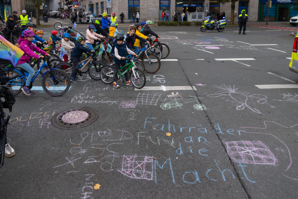 Trotz der schon angefangenen Herbstferien fanden viele Menschen den Weg (auch über Zubringer) zum Platz der Alten Synagoge. Von da aus zog die Kidical Mass über den halben Wall. Am Burgtor haben die Kinder wieder dafür gesorgt, dass eine grosse innerstädtische Kreuzung durch Kreide bunt geworden ist und es für ein paar Stunden geblieben ist, auch wenn wenig später wieder die Autos diese Stelle dominiert haben. Vom Burgtor aus ging es mit einigen Schlenkern am Hauptbahnhof vorbei durch die Schützenstraße Richtung Fredenbaumpark, wo so manches Kind den Nachmittag noch auf dem Abenteuerspielplatz hat ausklingen lassen.